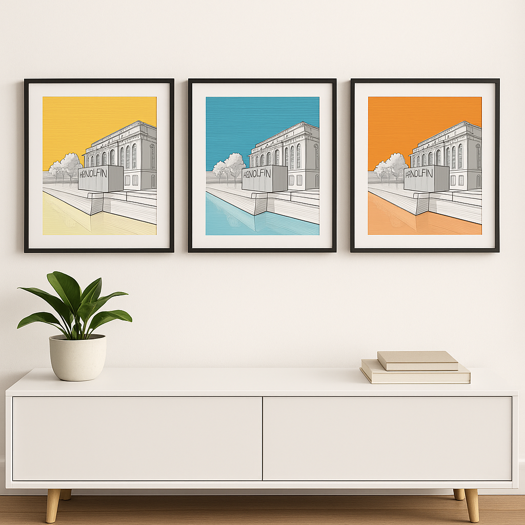 Celebrate Bristol’s vibrant arts heart through three refined architectural illustrations of the Arnolfini by Robert Kann. Each variant — Yellow, Blue and Orange — offers a distinct colour-mood while retaining the same precise line-drawing of the harbourside landmark.