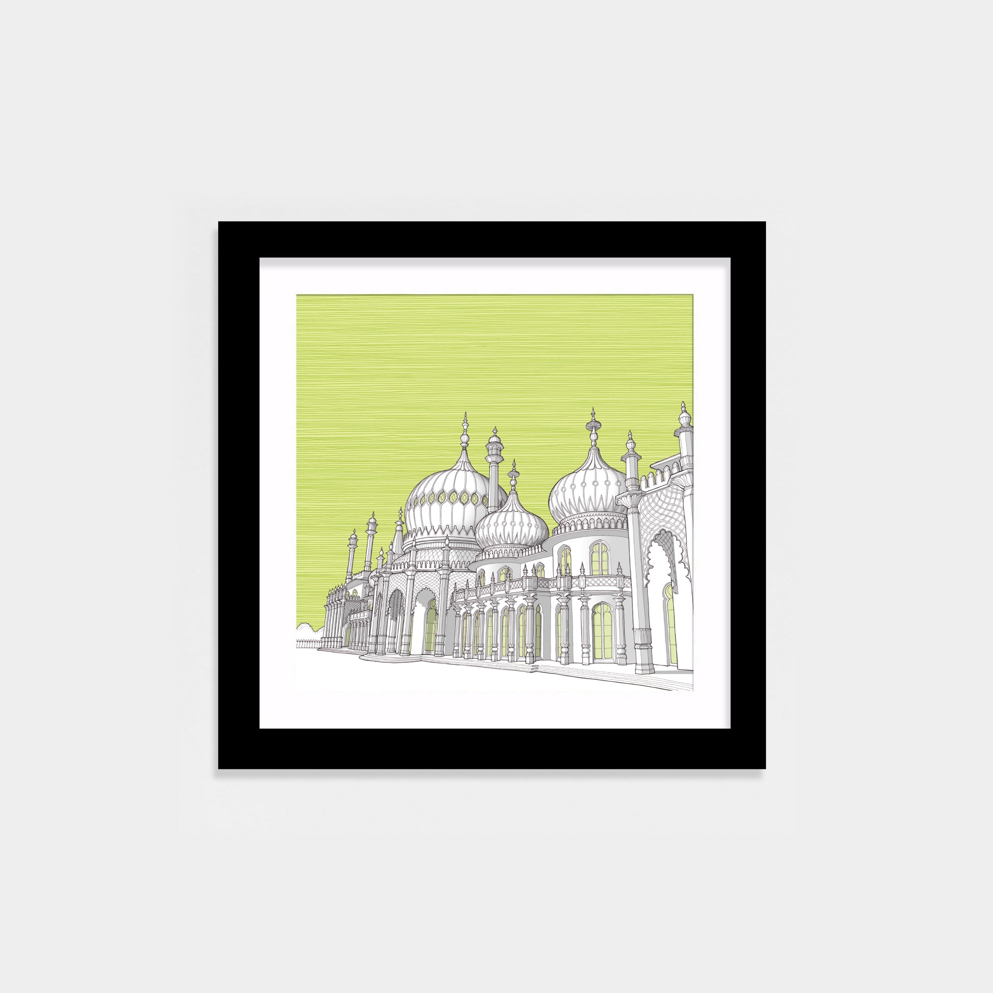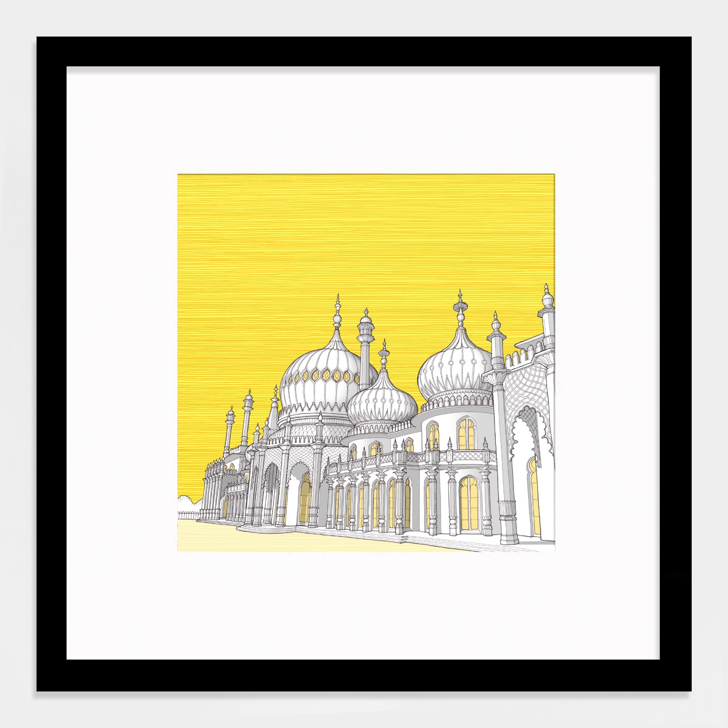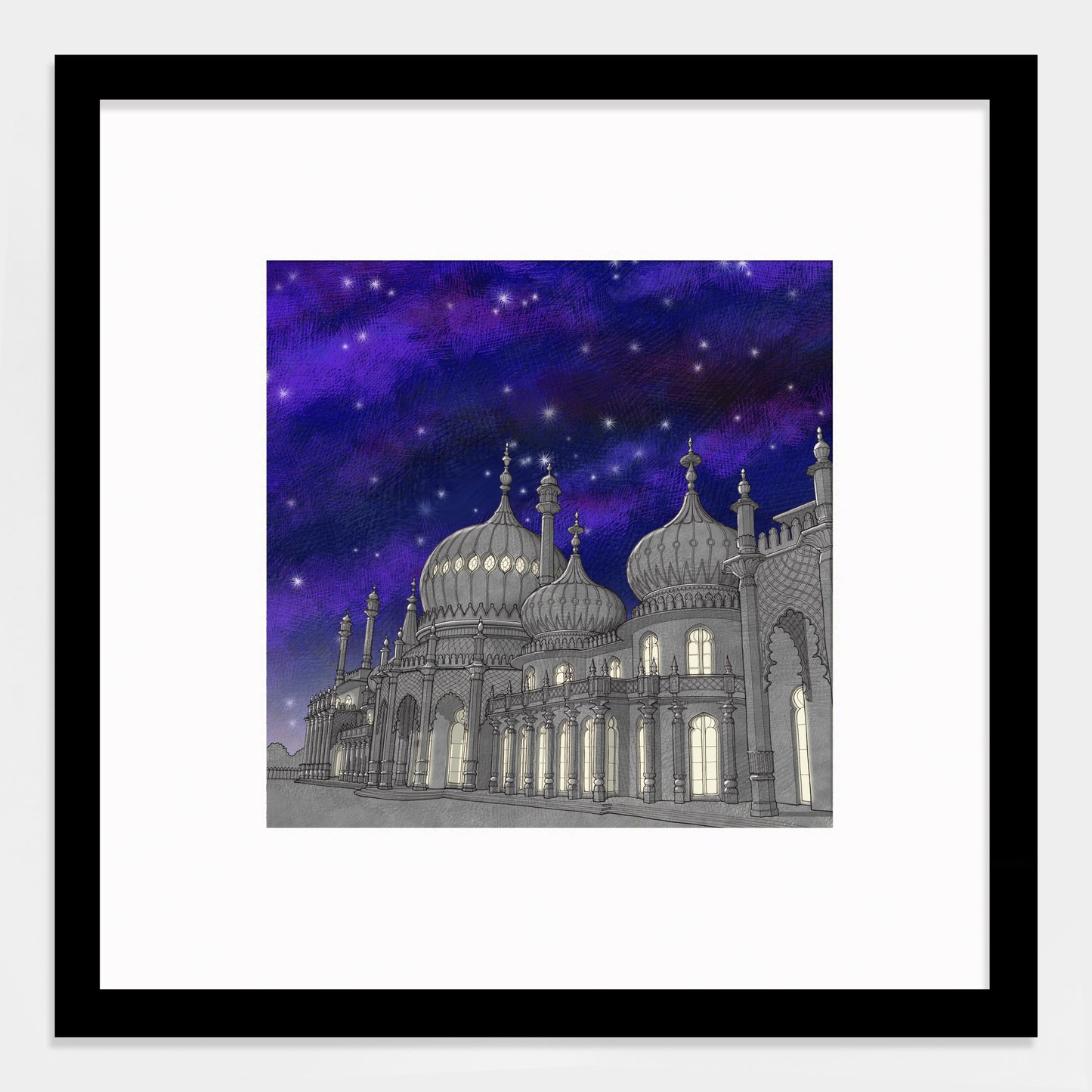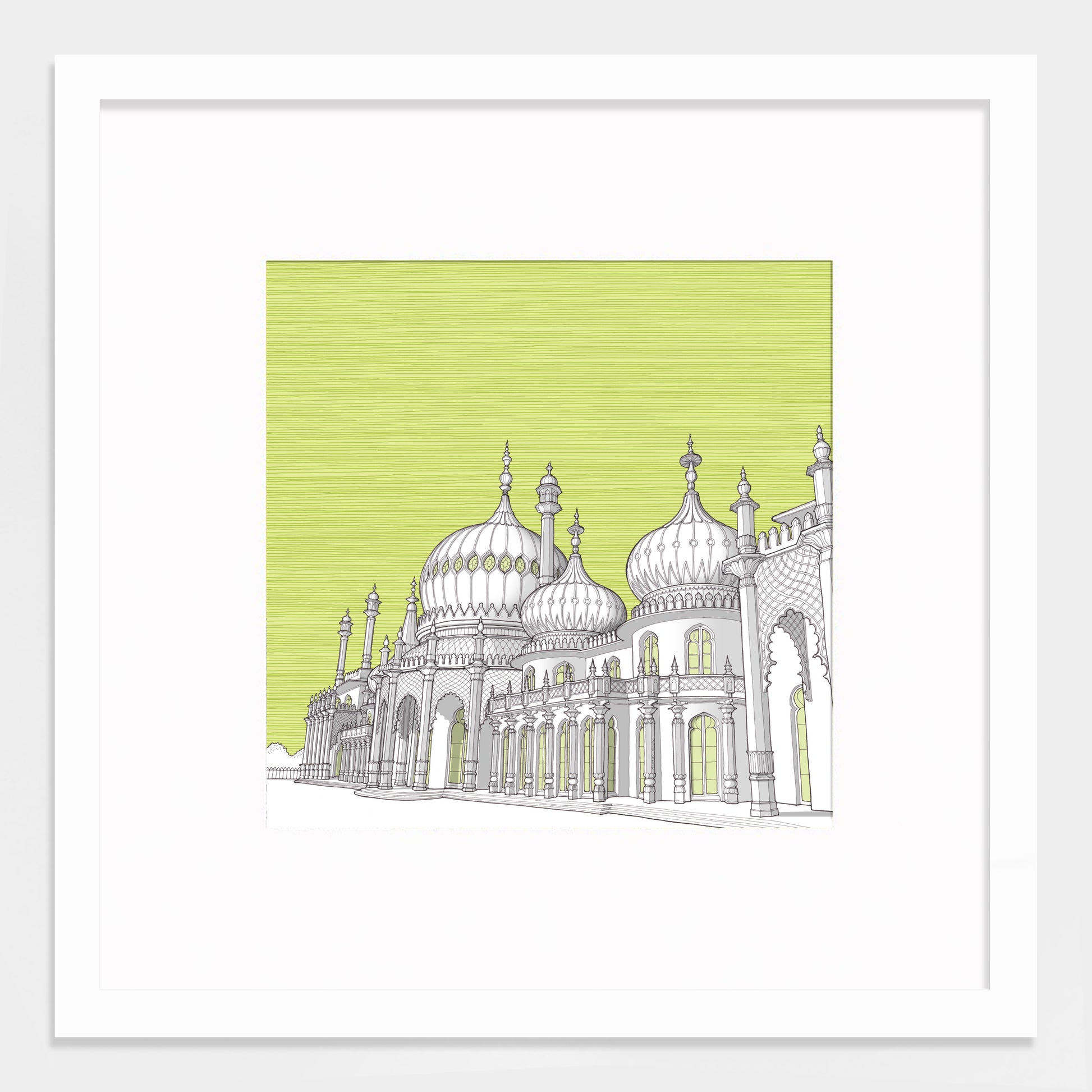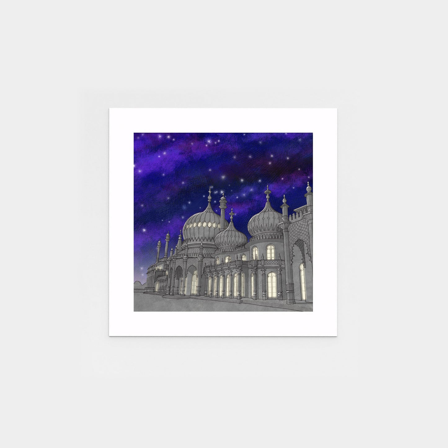 Limited edition Giclée print of the spectacular Brighton Pavilion. Built as a seaside pleasure palace for King George IV, this historic house mixes Regency grandeur with the visual style of India and China.